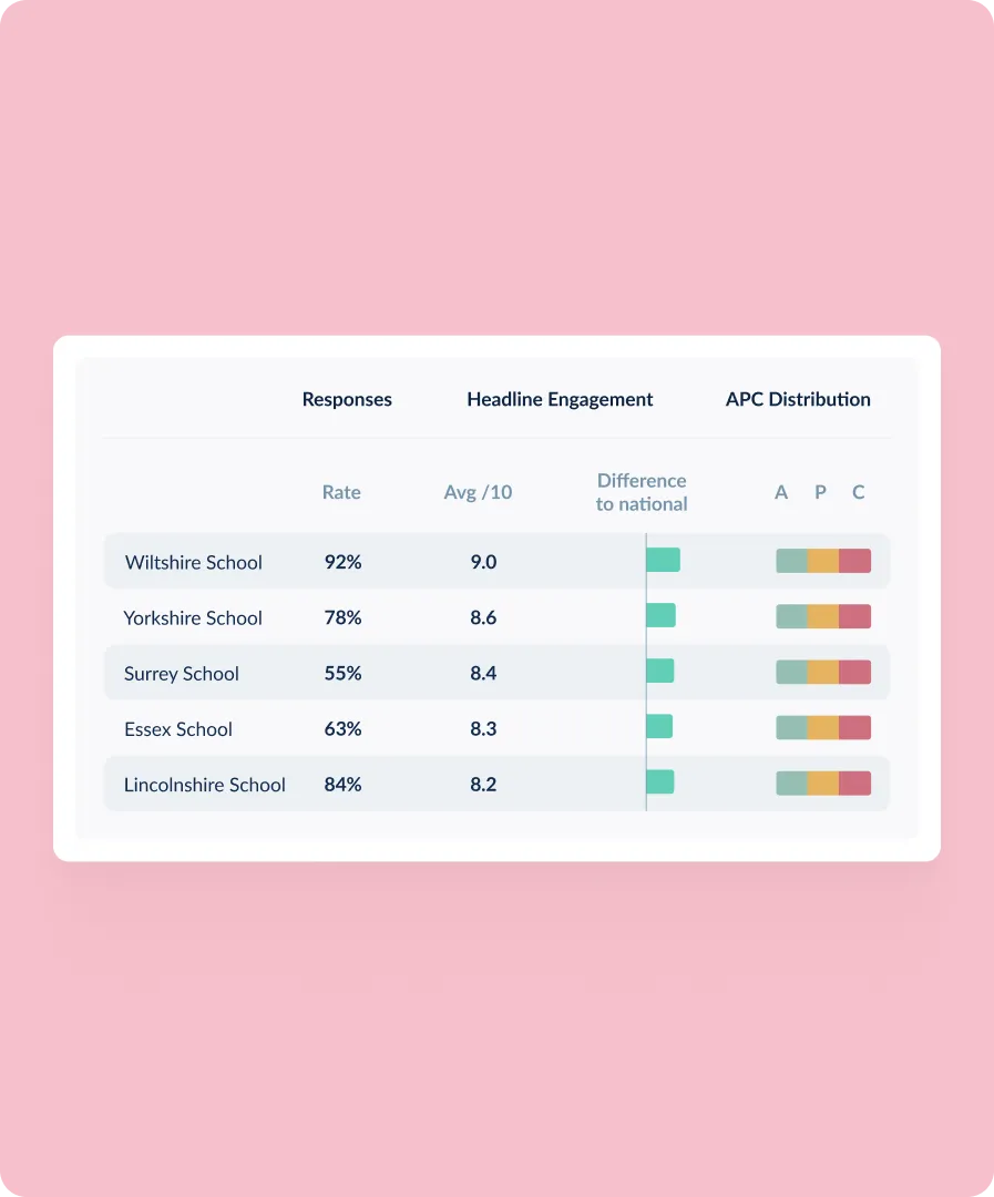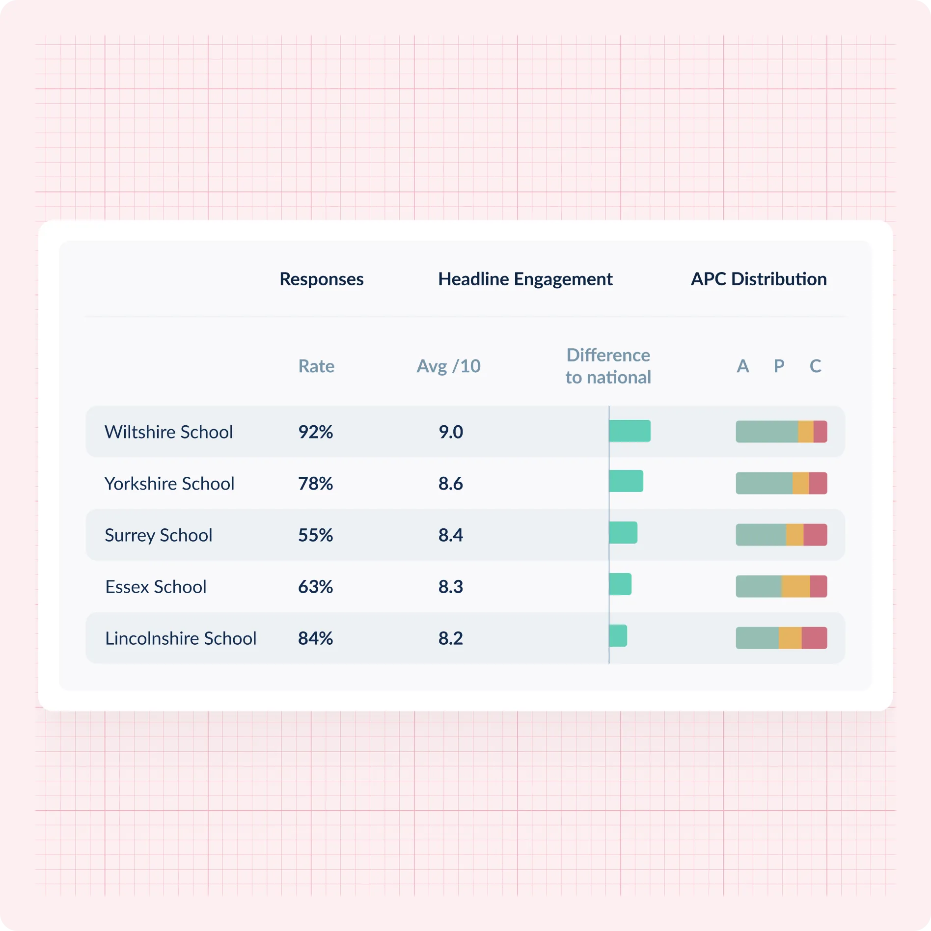 - Comprehensive insight: Gives trust leaders a current view of engagement across schools by monitoring shifts in staff morale, pupil motivation, and family confidence over time.
